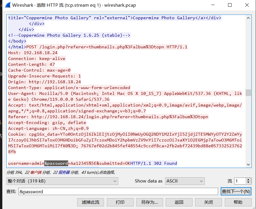 wireshark 打开,先过滤 http 请求,然后追踪 http 流,通过关键字 &password 搜索,找到返回为 302 跳转的请求。